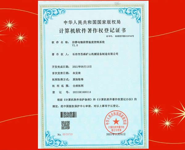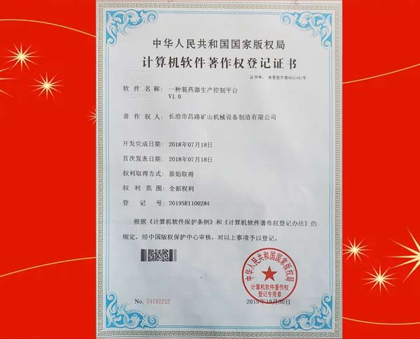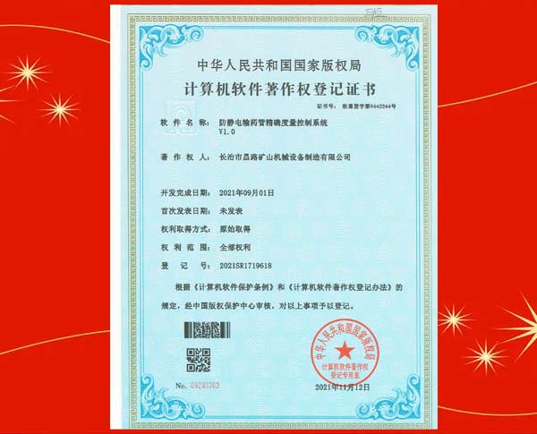 榮獲裝藥器生產(chǎn)控制平臺著作權登記證書