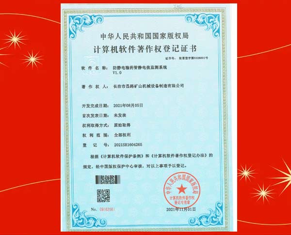 榮獲防靜電輸藥管靜電值監(jiān)測系統(tǒng)著作權登記證書